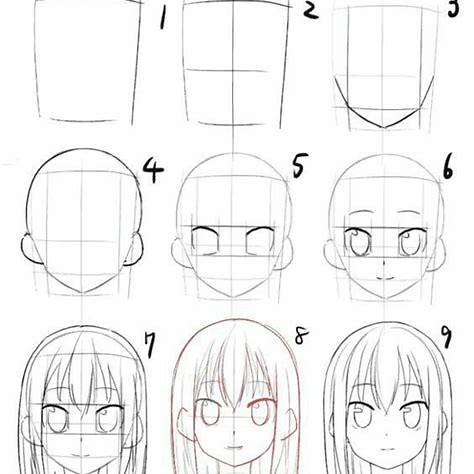 First, you draw a circle, then you put a line from the top to the bottom. The next step is to draw a triangle that makes the chin and the cheecks. The triangle starts in the bottom of the circle and it stops in the central line, making the shape of the face.