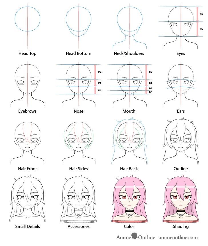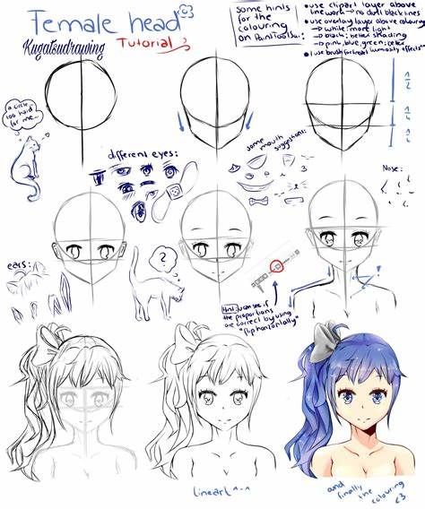 Then start with the hair. Chose your character a type of bang and draw it. This part is so inventive, you can designe your character hair style, you chose. If you dont know how to draw hair, or eyes, don’t worry, I will make a tutorial specific for those. Draw hair sides and back part. Make detailes and borow the guide lines. Paint it of the colors you want and shade it, and it’s done! I have a video to explain it, and here you have a foto to guide you.